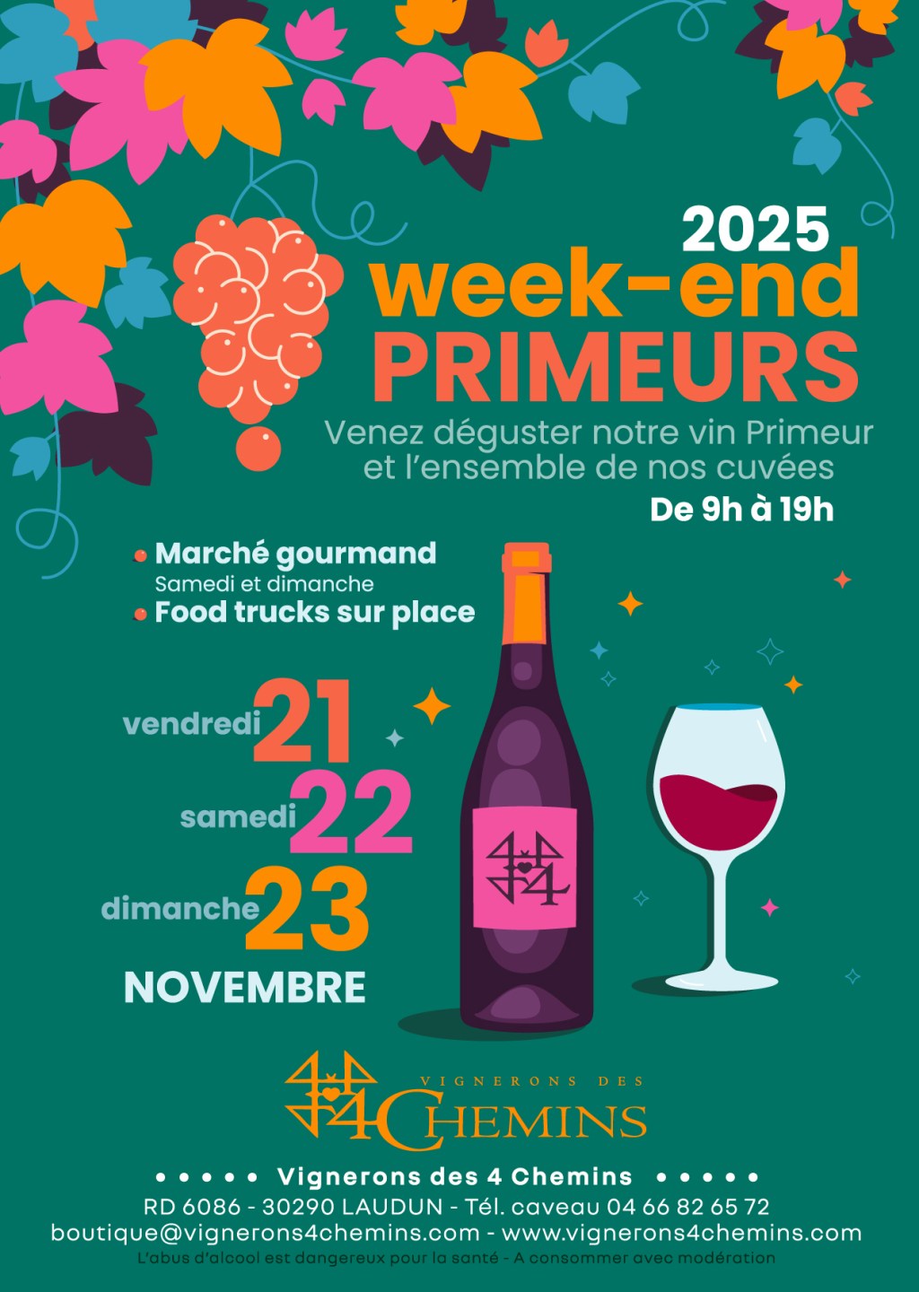 L’événement se déroulera au caveau situé RD 6086 à Laudun, où l’équipe des Vignerons des 4 Chemins accueillera le public tout au long du week-end.